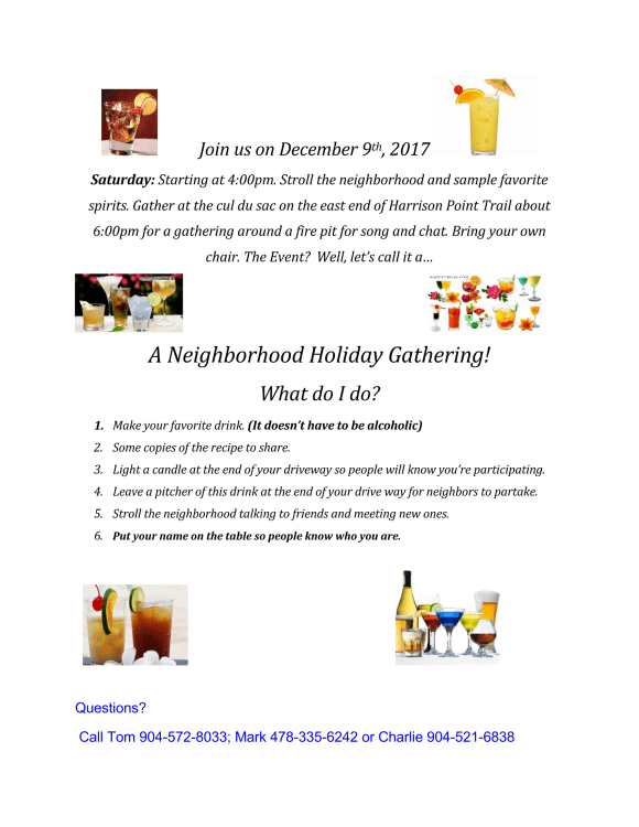 Categories Uncategorized Dec. 9 – Drink-A-Round Post author By rbarber2014 Post date November 18, 2017 No Comments on Dec. 9 – Drink-A-Round Share this: Share on X (Opens in new window) X Share on Facebook (Opens in new window) Facebook Like Loading... ← Annual Meeting – Minutes of 2016 Annual Meeting → Covenants Reminder Leave a Comment Cancel reply Δ